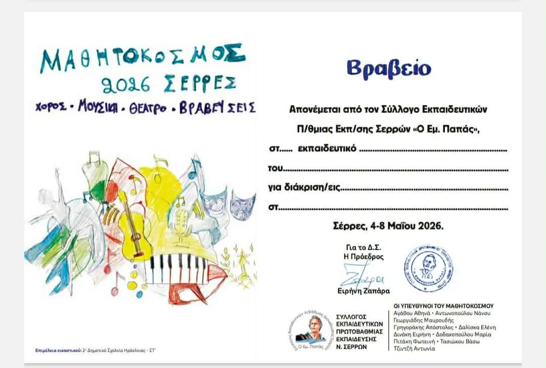 Θερμά συγχαρητήρια στις μαθήτριες της ΣΤ΄ τάξης του 2ου Δημοτικού Σχολείου Ηράκλειας, Κίτκου Κωνσταντίνα και Γκόγκου Μελπομένη, καθώς οι ζωγραφιές τους επιλέχθηκαν να εκπροσωπήσουν τον Μαθητόκοσμο 2026 στις Σέρρες: η μία για το βραβείο των εκπαιδευτικών και η άλλη για το εξώφυλλο του προγράμματος.