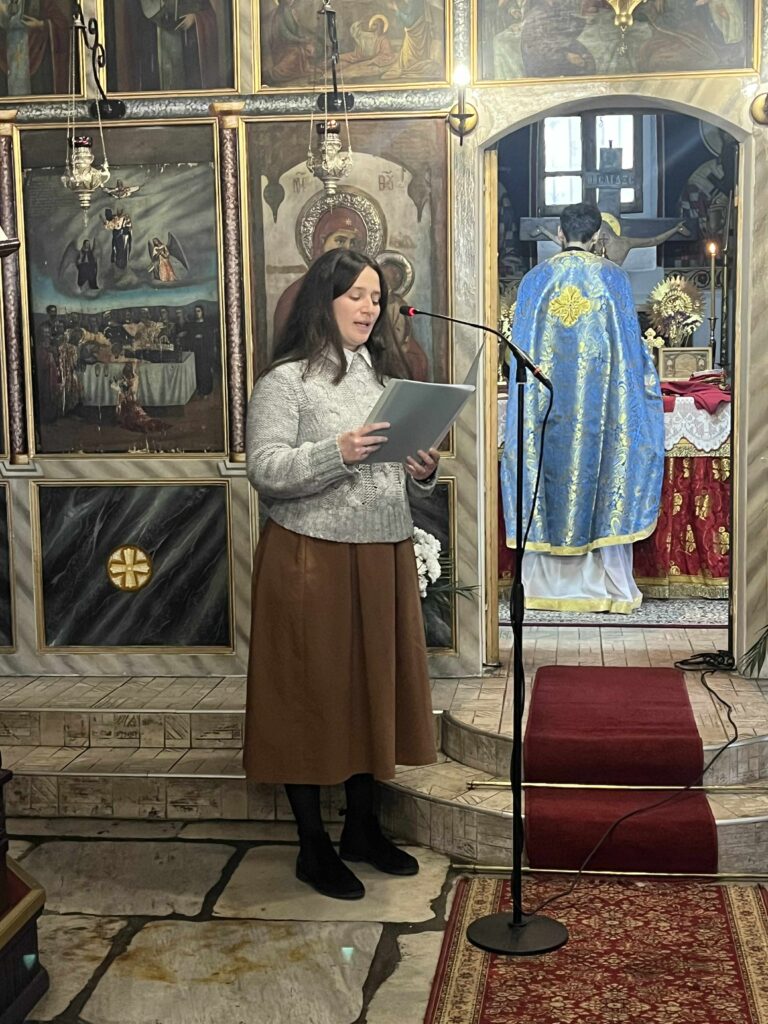 Τον λόγο κατά τη διάρκεια του εκκλησιασμού ανέλαβε η εκπαιδευτικός του σχολείου μας, κα Ελένη Κουρτίδου, η οποία αναφέρθηκε με απλό και κατανοητό τρόπο στο νόημα και στη σημασία της εορτής των Τριών Ιεραρχών για τη σχολική κοινότητα.