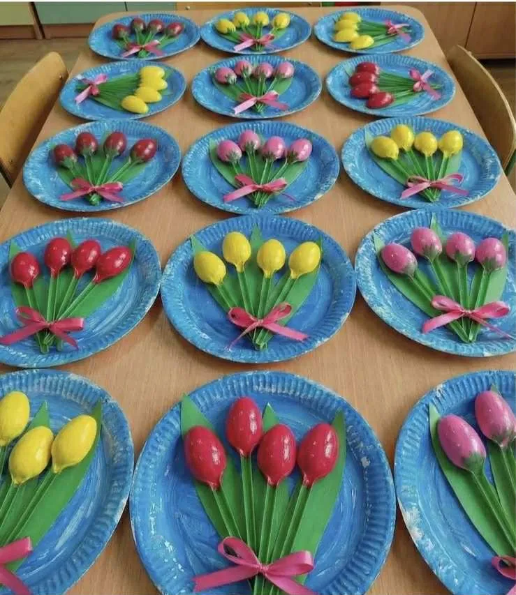 Οι μαθητές μας, με την καθοδήγηση των δασκάλων τους, κατασκεύασαν πανέμορφες, πολύχρωμες τουλίπες χρησιμοποιώντας κουτάλια και έντονα χρώματα. Κάθε μικρή ανθοδέσμη, τοποθετημένη με φροντίδα πάνω σε γαλάζια πιάτα και στολισμένη με κορδέλες, συμβολίζει την ομορφιά και την τρυφερότητα της μητρικής αγκαλιάς.