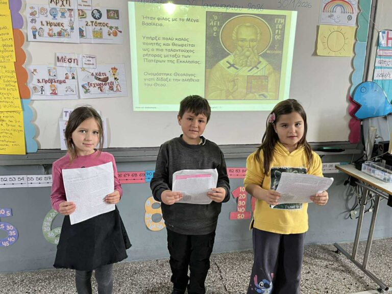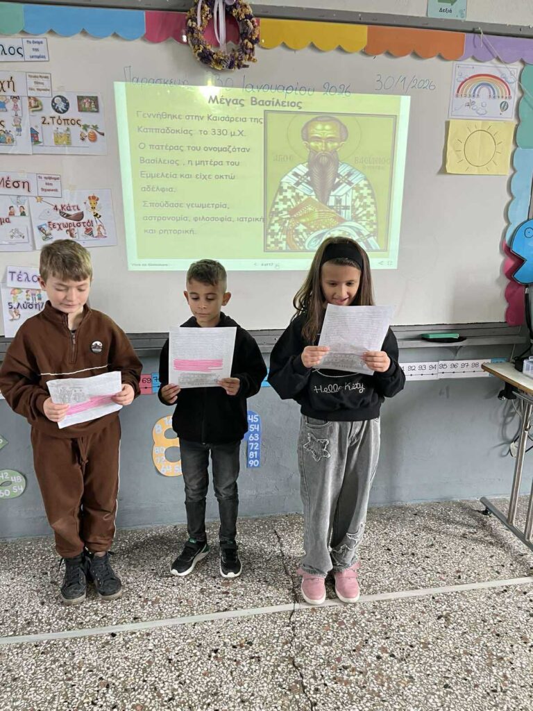 Στο πλαίσιο του εορτασμού των Τριών Ιεραρχών και σύμφωνα με τη σχετική εγκύκλιο του Υπουργείου Παιδείας ,Θρησκευμάτων και Αθλητισμού, οι εκπαιδευτικοί του σχολείου μας, υλοποίησαν δίωρη δράση με στόχο τη γνωριμία των μαθητών με το έργο και την προσφορά των Τριών Ιεραρχών στην Παιδεία.
